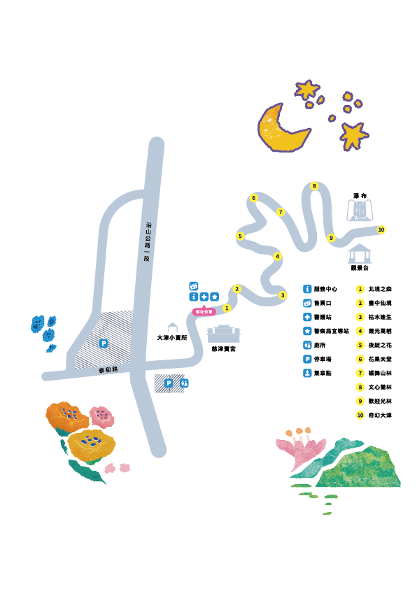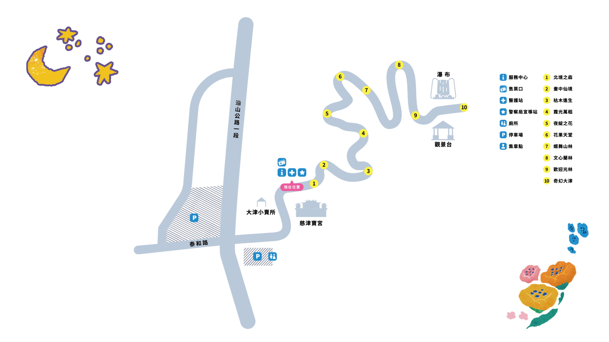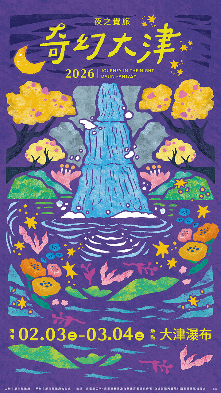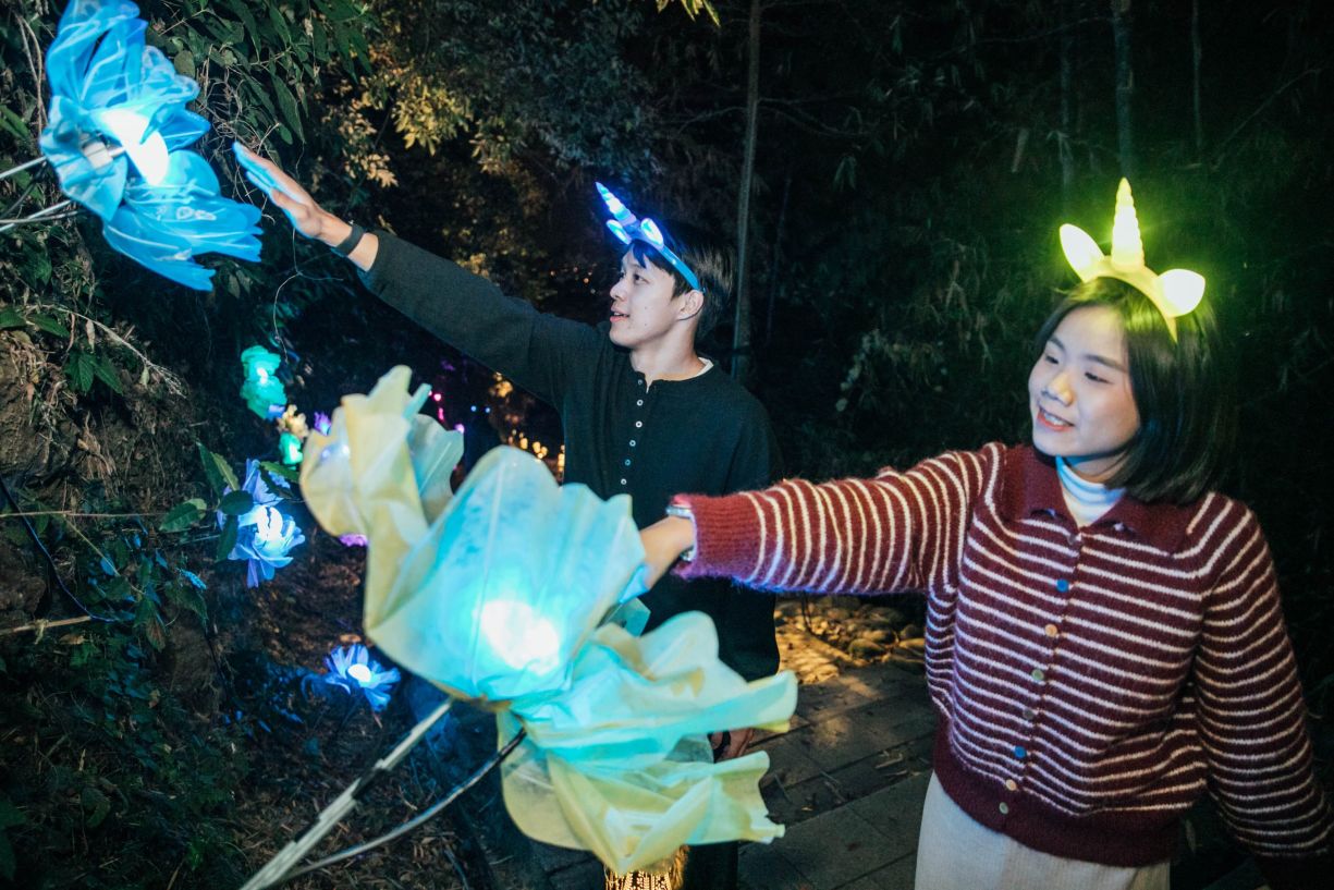 On the way to Dajin Waterfall, beautiful gems reveal themselves at night, enhancing the brilliance of the path and bestowing blessings upon the visitors.